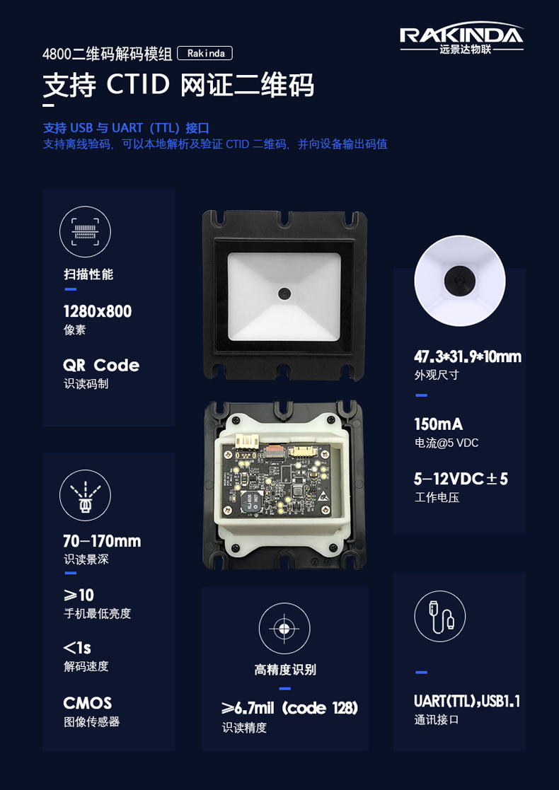 4800 模組是基于遠景達CTID 二維碼解碼模組開發(fā)的,針對網(wǎng)證CTID的各種應(yīng)用場景設(shè)計的硬件級模組,可用于識別驗證國家防疫健康碼,具備網(wǎng)證CTID的解碼、驗碼等能力。