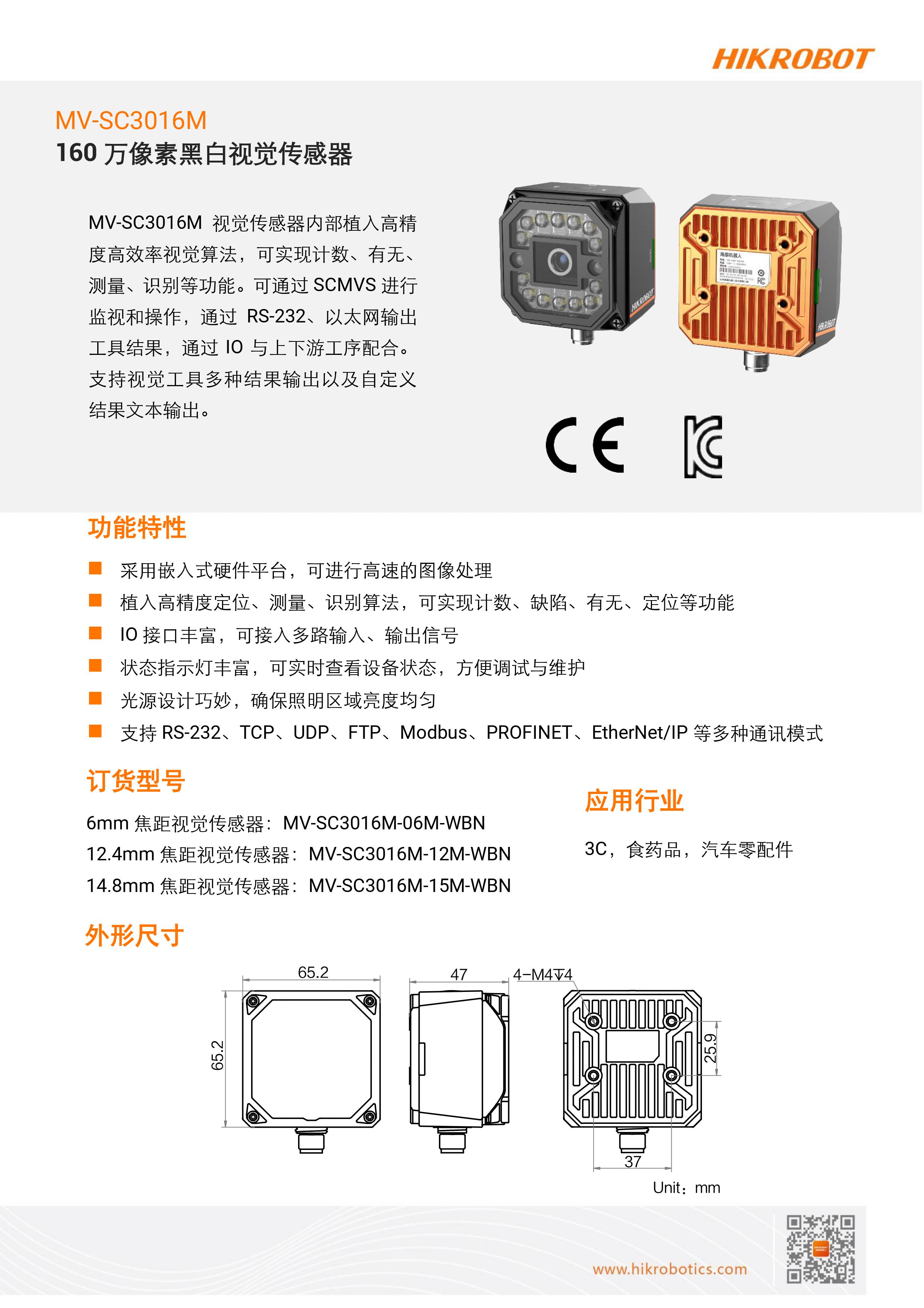 MV-SC3016M-160 萬像素黑白視覺傳感器